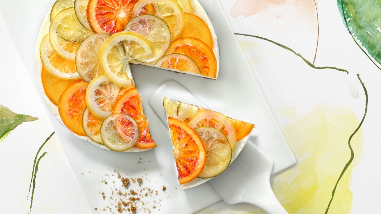 5. Versez la préparation dans le moule avec les biscuits écrasés et placez-le au réfrigérateur pendant 4 h. Lorsque le cheesecake a pris, décorez-le en superposant les tranches d’agrumes confites soigneusement égouttées et conservez-le au frais jusqu’au moment de servir.
