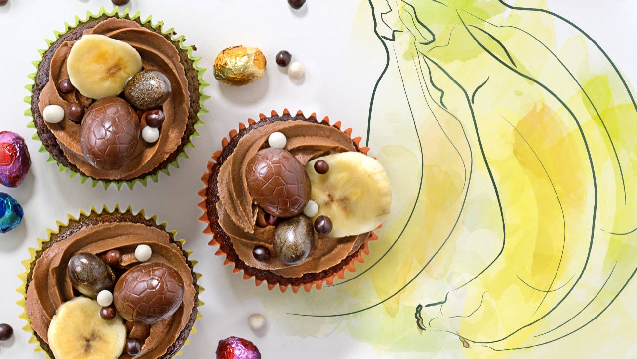 9. Vérifiez que les cupcakes ont complètement refroidi puis décorez-les avec le glaçage, les petits œufs et une rondelle de banane citronnée.