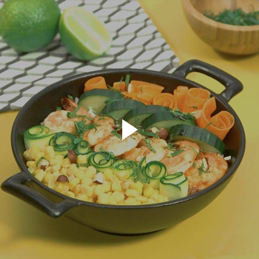 1. Dans un grand bol individuel, déposez un fond de riz. Ajoutez par rangées les tagliatelles de légumes, les crevettes, puis les rondelles de concombre et le maïs.