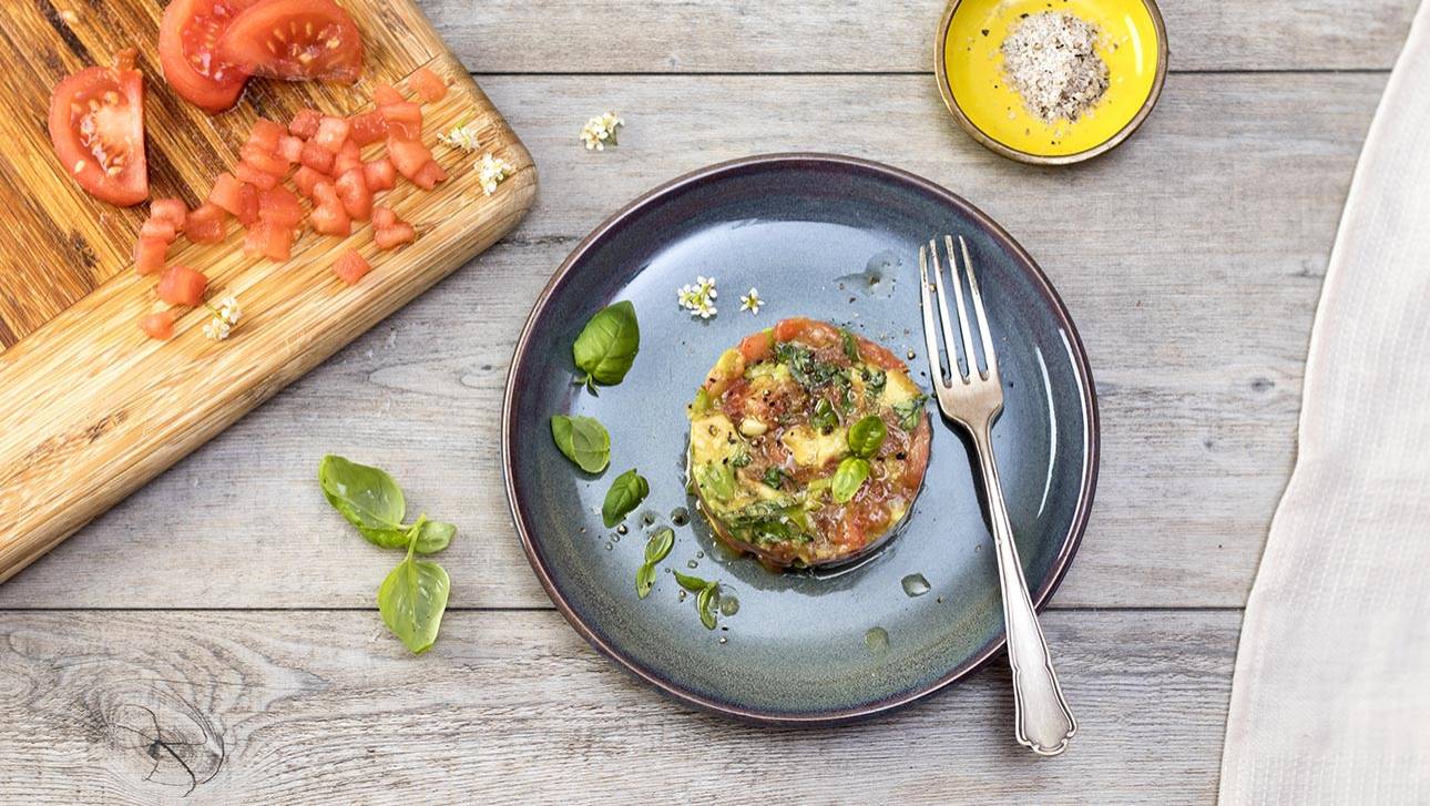 5. Décorez le tartare avec un peu de poivre, un filet d’huile d’olive et quelques feuilles de basilic.