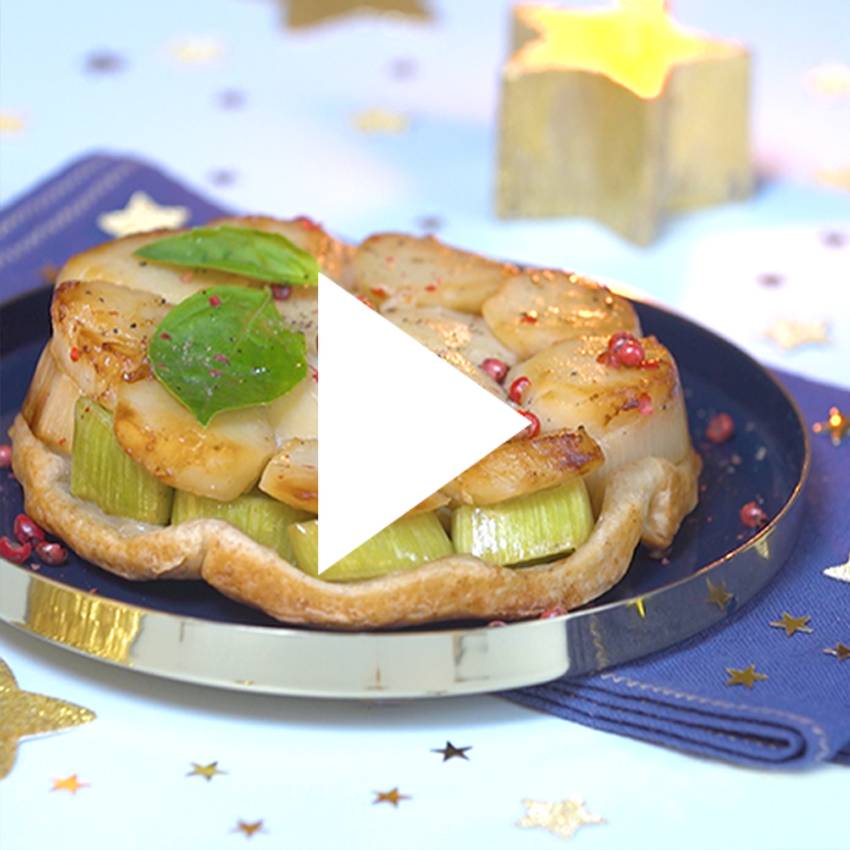6.Déposer les noix de Saint-Jacques en rosace dans le fond des 4 ramequins. Déposer ensuite les tronçons de poireaux debout et en rosace sur les noix de Saint-Jacques. Couvrir avec le rond de pâte feuilletée en faisant attention de bien rentrer les bords de la pâte. Dorer au jaune d'oeuf et faire reposer 15 min au frais.